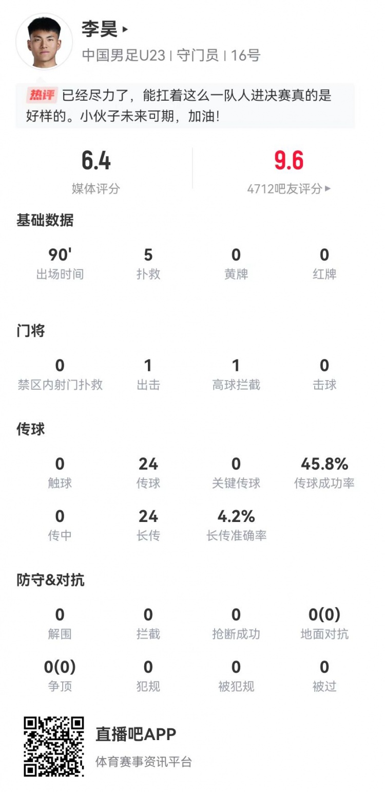 李昊本场数据:5次扑救+丢4球 24次长传1次成功 获评6.4分